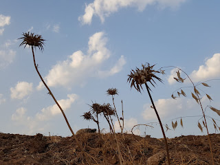הערב יצאתי לסיור בעקבות המפגש בהשתלמות "למידה חווייתית היברידית המשלבת אומנויות וטבע". יותר נכון יצאנו יחד, אני ונועם, בני הצעיר. במיוחד בתקופה הזו אני מנצלת כל הזדמנות לשהייה משותפת שלנו בחוץ. הלכנו בשביל של הגינה השכונתית, קנינו ארטיקים במכולת ודיברנו. נועם עדיין היה נסער ממה שקרה בבוקר עם המורה, בזום. אחרי כמה דקות הגענו לשטח הפתוח בשכונה. בעצם זה לא רק ה"שטח הפתוח" זה המקום "שלנו". לחלק האחד שלו קראנו גבעת הרוח, כי תמיד כשעולים למעלה נושבת רוח נעימה, לפעמים אפילו חזקה. מול גבעת הרוח יש גבעה נוספת, שתי הגבעות מופרדות על ידי ואדי דמיוני בו עובר נחל...דמיוני כמובן. התקרבנו ועלינו לאט על הגבעה. כבר מרחוק הבחנו בלהקת יונים שליקטה זרעים. כשהתקרבנו ראינו גם שתי מיינות, עורב וכמה צוצלות. פתאום שמנו לב שבין כל הציפורים מקפץ נחליאלי אחד קטן. איזו הפתעה! נחליאלי ראשון שראינו השנה. ממש שמחתי. ומכיוון שלא פעם אנחנו רואים ציפורים על הגבעה הזאת החלטנו לתת לה שם "גבעת הציפורים". מגבעת הציפורים עלינו לגבעת הרוח. ישבנו כמה רגעים בשקט, נהנים מהארטיקים ומהאווירה הפשוטה. סביבנו אדמה חומה-כתומה וגבעולים ירוקים של קנה ששרדו את הקיץ, או אולי הרגישו את בוא הסתיו והחלו לצמוח. נועם ציין שהאדמה כאן לא חרושה לעומת האדמה בשדה שבו טיילנו לפני כמה ימים. ואז הוא קם, התרחק והתחיל לרוץ ולרקוד. דקות ארוכות רקד, שילב תנועות שהוא מכיר מאומנויות הלחימה. אחרי זה רץ אלי ובפנים קורנות אמר שבמקום הזה הוא מרגיש אנרגיות טובות. חייכתי. כמה שהוא צודק. שמחתי בשמחתו. נועם המשיך לרוץ, לרקוד ולשחק ואני הלכתי במרחק מה ממנו, לאט ובשקט. מתבוננת בסביבה, באדמה, בשמי הערב. מרגישה את הרוח הנעימה, את קרני השמש החמימות, קולות של ציפורים. אני אוהבת את הרגעים האלה, של שקט עם עצמי בטבע. איזה הפתעות אמצא הפעם שאוכל לצלם בשביל התרגיל? למען האמת למרות ההכרות עם השטח, המשימה סקרנה אותי. רציתי לגלות עוד דברים שאולי לא משכו את תשומת ליבי לפני כן. נועם חזר אלי וביקשתי ממנו שנחפש ביחד דברים מעניינים, צורות בחוזרות על עצמן, תבניות של הטבע. הרגשתי שהתרגיל גורם לנו להעמיק את ההתבוננות בפרטים הקטנים.
